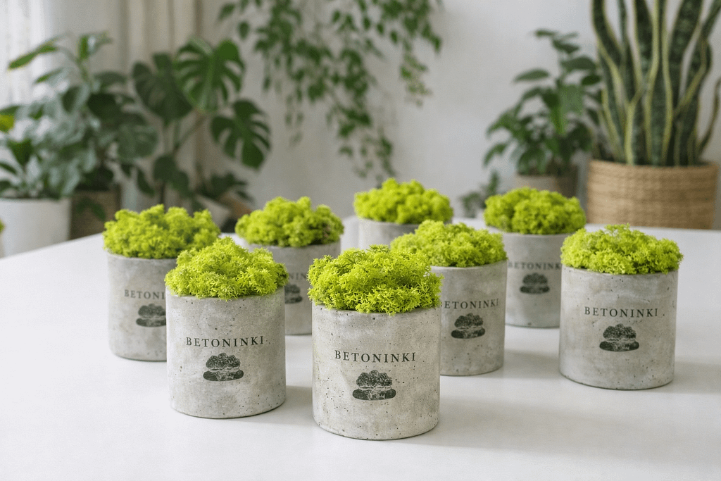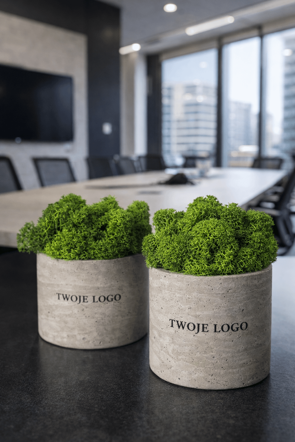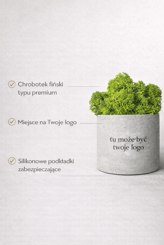 Ręcznie wykonana doniczka z betonu dekoracyjnego ze stabilizowanym chrobotkiem reniferowym i logo Twojej firmy.