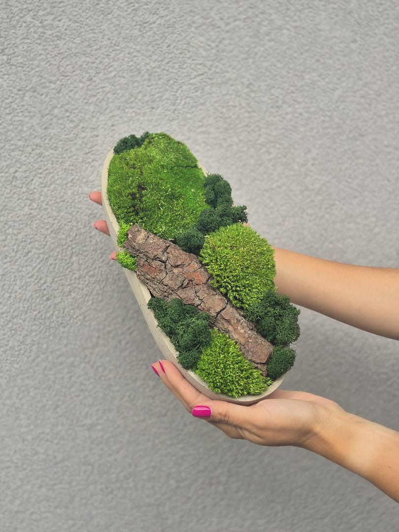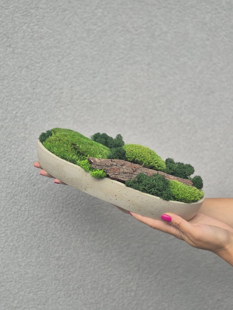 - Minimalistyczna forma: Surowy beton, z którego wykonana jest doniczka, w połączeniu z naturalną zielenią chrobotka tworzy harmonijną całość, idealnie pasującą do nowoczesnych, skandynawskich i loftowych wnętrz. Minimalistyczny design podkreśla piękno zarówno betonu, jak i chrobotka, tworząc elegancki i stylowy dodatek do każdego pomieszczenia.