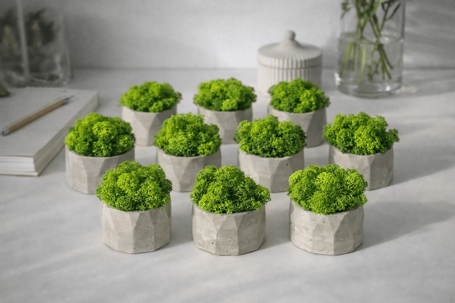 Oryginalna betonowa osłonka w kolorze szarym wypełniona sprężystym, miękkim chrobotkiem reniferowym to połączenie surowego designu z naturą, które doda charakteru każdemu wnętrzu. Chrobotek nie wymaga podlewania ani pielęgnacji, zachowując świeży wygląd przez długie lata — to dekoracja, która cieszy oko bez wysiłku.