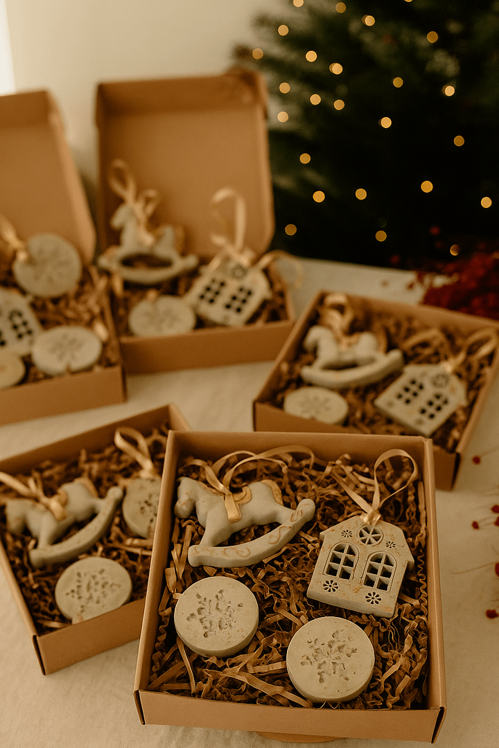 pakowane w ozdobny kartonik, gotowe do wręczenia jako świąteczny upominek.